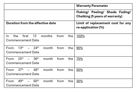 i. This warranty only provides for replacement cost of paint (“replacement cost”) as per the reducing scale provided hereinafter, solely for re-application purposes, in order to set right the affected areas. The Company shall at its own discretion decide on providing replacement of the Product or providing replacement cost of the Product in terms of the reducing scale provided hereinafter.